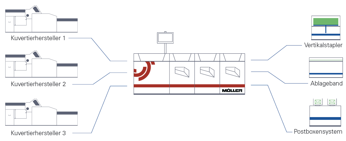 Wie schon bei Kern Kuvertiersystemen ist die Bedienung der Müller Systeme einfach und klar verständlich aufgebaut. Überall wo nötig wird der Bediener der Anlage mit Bildern und Grafiken unterstützt.