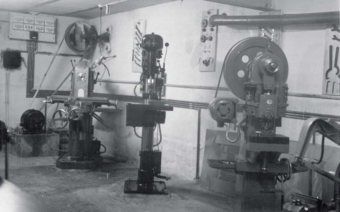 Die Anfänge: Ein starkes Team entwickelt die erste Falz- und Kuvertiermaschine mit modernen, transmissionsgetriebenen Werkzeugmaschinen.